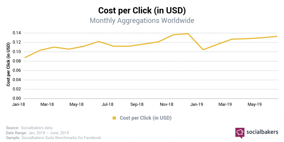 Another key metric to look at is the cost-per-click trends across Facebook’s services. We can see that cost per engagement is continuing to increase. On average we are seeing an increase in cost-per-click of 12%, and some regions have shown an even more significant change – up to 45% in the Middle East compared to the same quarter in 2018.