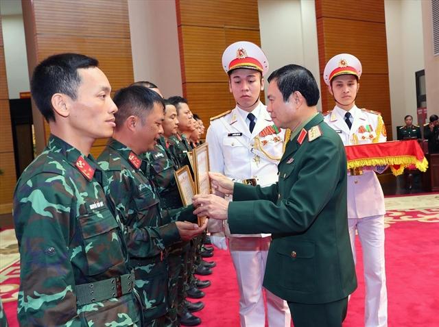 | Senior Lieutenant General Nguyễn Tân Cương awards the Certificate of Merit of the Minister of National Defence to rescuers. —VNA/VNS Photo |