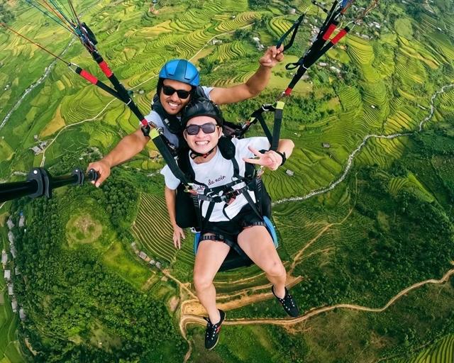 | A tourist enjoys a flight to experience the stunning terraced rice fields in Mù Cang Chải District in the northern mountainous province of Yên Bái. — VNA/VNS Photo |